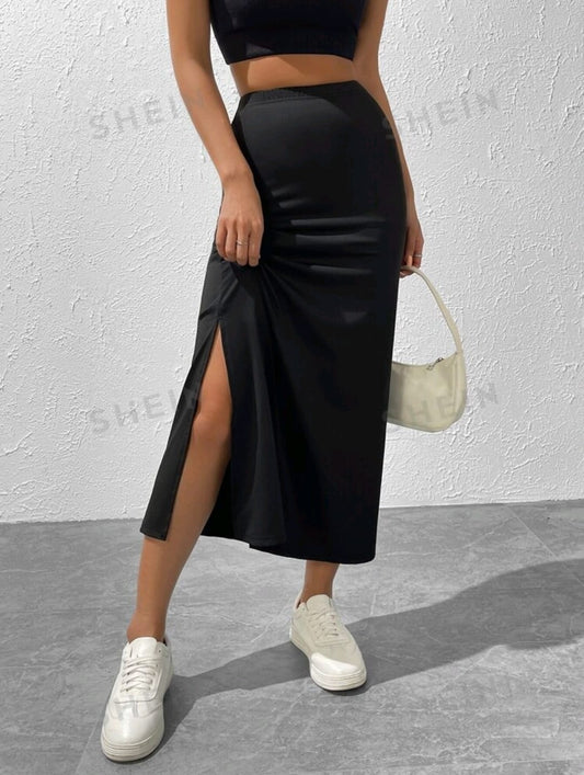 Flirla Vestido largo con abertura en el muslo y drapeado en la parte sólida