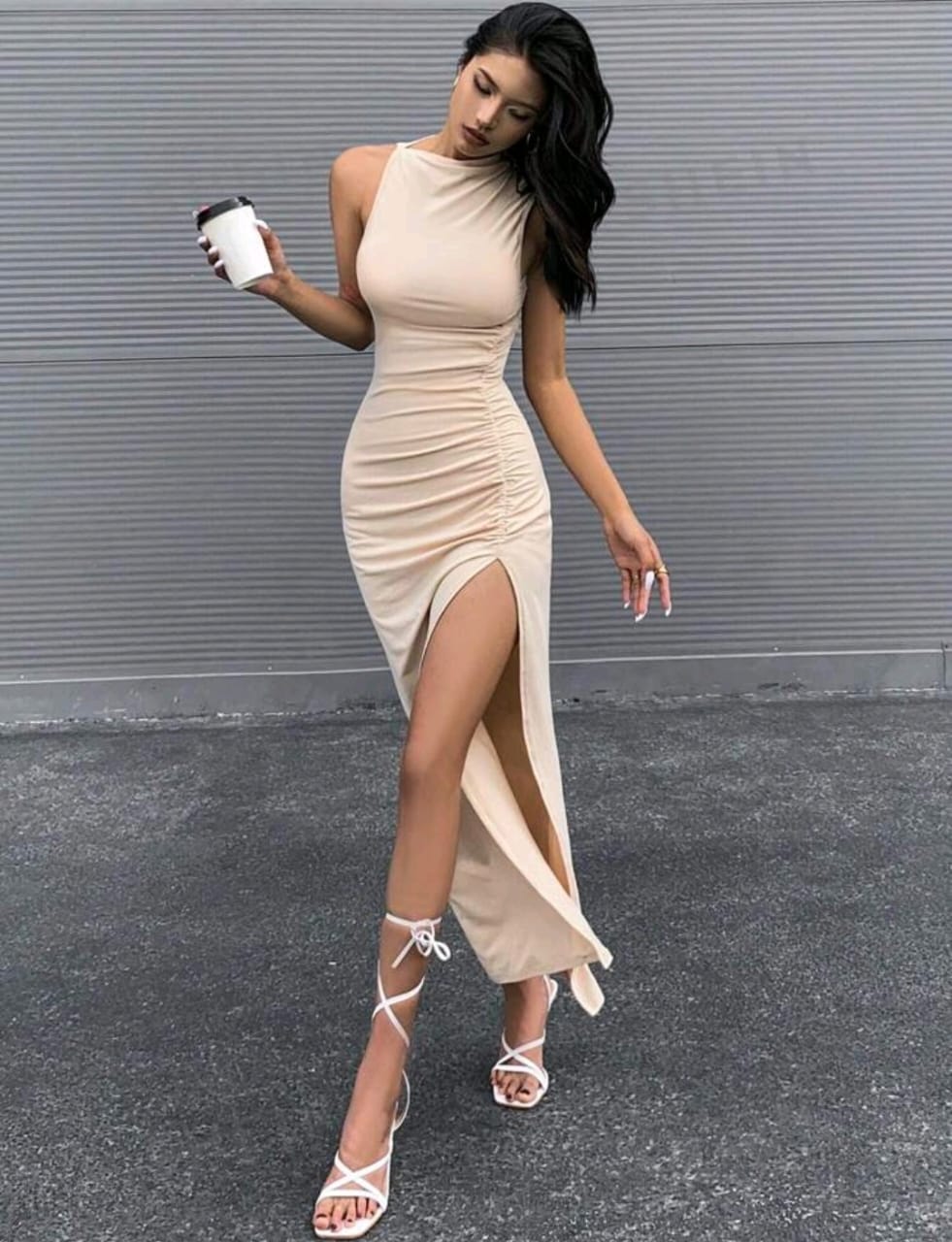 Flirla Vestido largo con abertura en el muslo y drapeado en la parte sólida