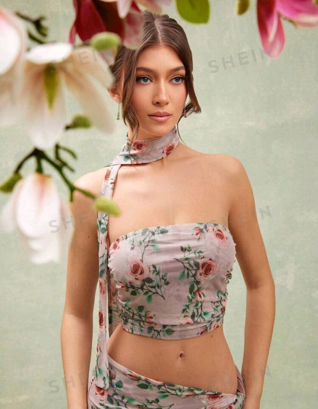 Aloruh Conjunto de top bandeau y falda de cola de pez con estampado de mariposas