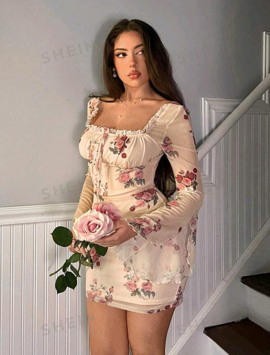Firerie Vestido mini ajustado con volantes y estampado floral romántico y elegante