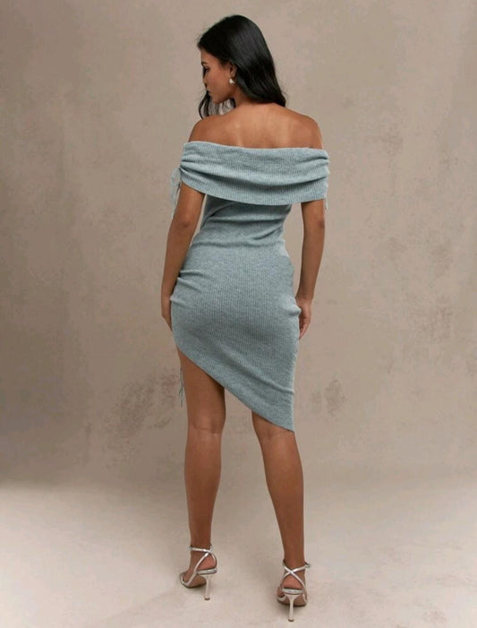 MISSGUIDED Vestido largo tipo bardot con manga de punto acanalado, pliegues y abertura en el bajo